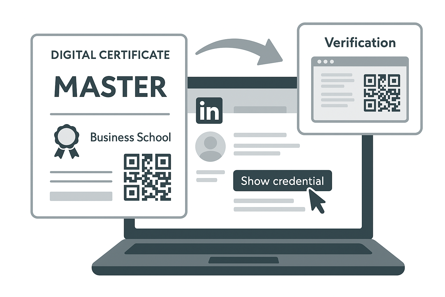 Questo documento – firmato digitalmente dalla Business School – è pensato per essere caricato in pochi secondi nella sezione «Licenze e certificazioni» del tuo profilo LinkedIn, dove comparirà la certificazione, con la possibilità, tramite il pulsante «Mostra credenziale», di aprire la schermata di verifica dell’Attestato stesso.